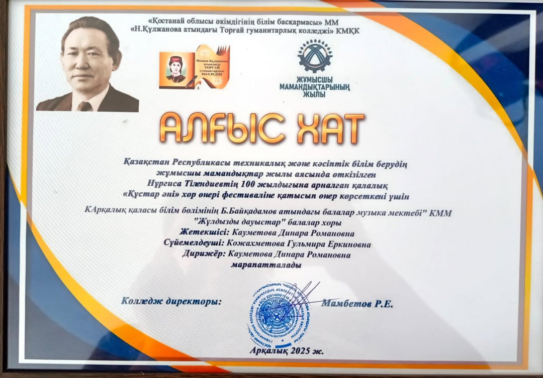 "Жұлдызды дауыстар" балалар хоры алғыс хатпен марапатталды.