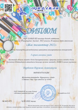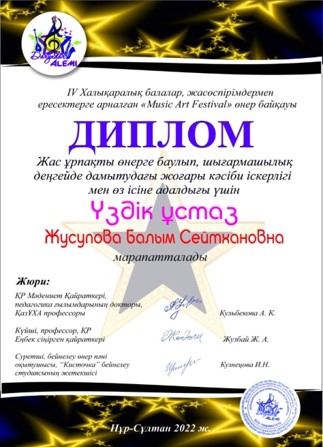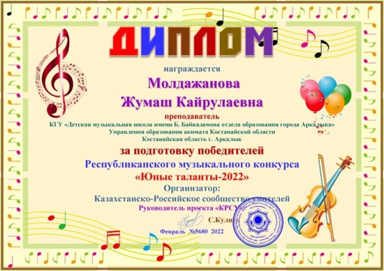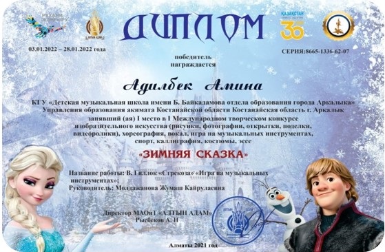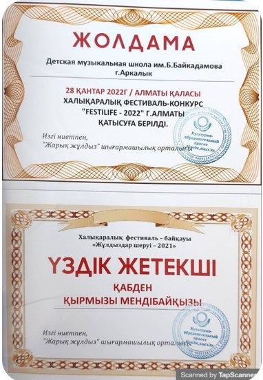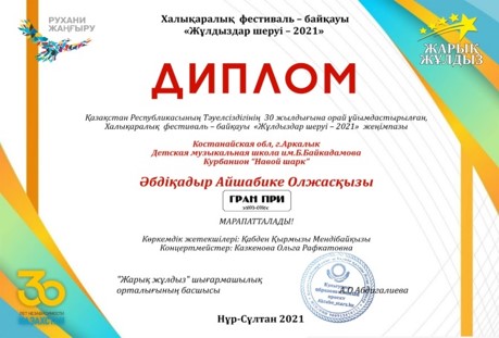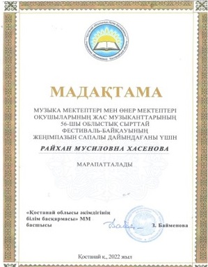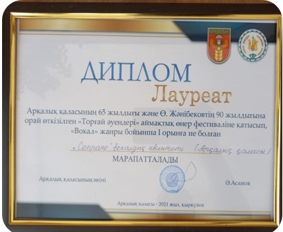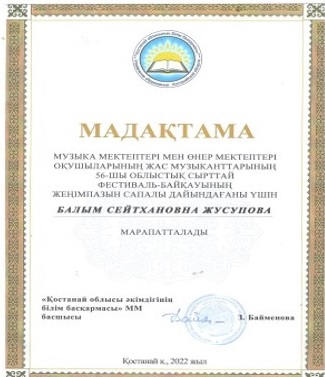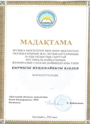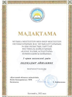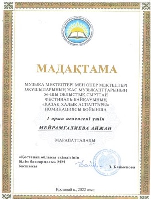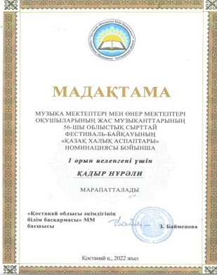 Қостанай облысы әкімдігі білім басқармасының «Психологиялық қолдау және қосымша білім беру дамыту өңірлік орталығы» КММ ұйымдастыруымен қашықтық форматта "Балалар музыка мектептері мен балалар өнер мектептерінің халық бөлімінің оқушылары – жас музыканттардың 56-ші облыстық білім беру фестиваль-байқауы" болып өткен болатын.Облыстық сырттай байқау 1-18 аралығында өткізілді. Жас айырмашылығы бойынша топтарға бөлініп өткізілген бұл байқаудан біздің мектебіміздің оқушылары орта жас тобы бойынша домбыра аспабының 4 сынып оқушысы Қадыр Нұрәли 1-орын, 5 сынып оқушысы Әбдіқадыр Айшабике 3 орын, үлкен жас тобы арасында қобыз аспабының 8 сынып оқушысы Мейрамгалиева Айжан 1 орын, домбыра аспабының 8 сынып оқушысы Жаңбыршы Томирис 3 орындарды иеленді.