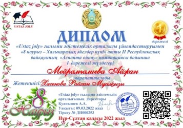 Мейрамғалиева Айжан Мейрамғалиқызы Жетекшісі-Хасенова Райхан Мусиловна |