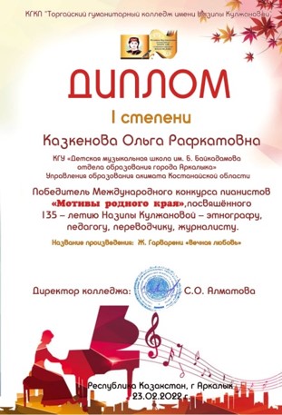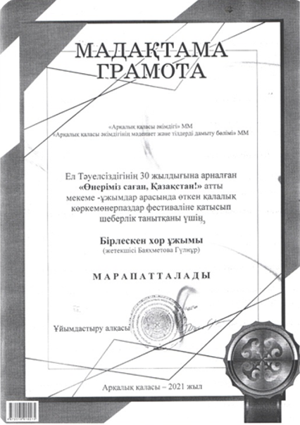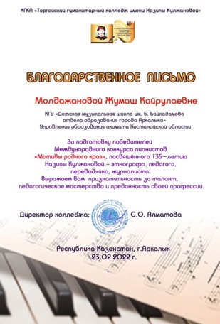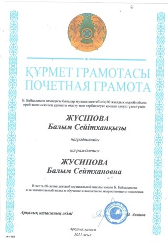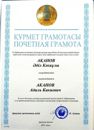 Б.Байқадамов атындағы балалар музыка мектебі КММ-нің 60 жылдық мерейтойына орай арнайы қала әкімінің Құрмет грамотасымен марапатталған мұғалімдер