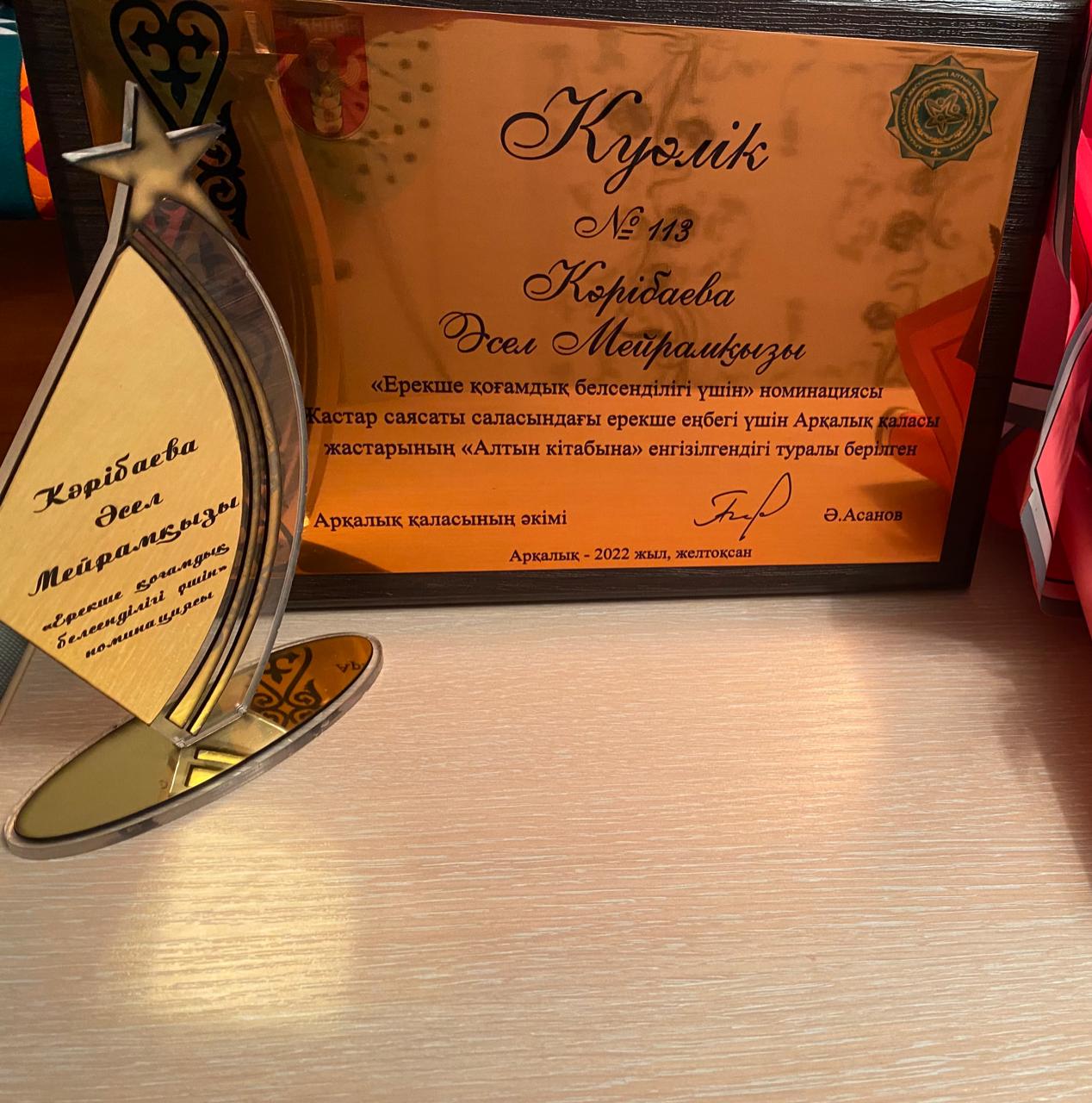 Арқалық қаласының әкімі жылдағы дәстүр бойынша салтанатты жиында түрлі салада жетістікке жеткен қала жастарына есімдері «Алтын кітапқа» енгені туралы арнайы куәліктерін табыс етті. Ел игілігі үшін еңбек етіп жүрген дарынды жастардың қатарында Қостанай облысы әкімдігі білім басқармасының «Арқалық қаласы білім бөлімінің Бақытжан Байқадамов атындағы балалар музыка мектебі» коммуналдық мемлекеттік мекемесі домбыра сыныбының мұғалімі Карибаева Асель Мейрамовнаның есімі «Ерекше қоғамдық белсенділігі үшін» номинациясы бойынша «Арқалық қаласы жастарының Алтын кітабына» енгізілді.Әріптесімізді шын жүректен құттықтай отырып, толағай табыстар тілейміз.