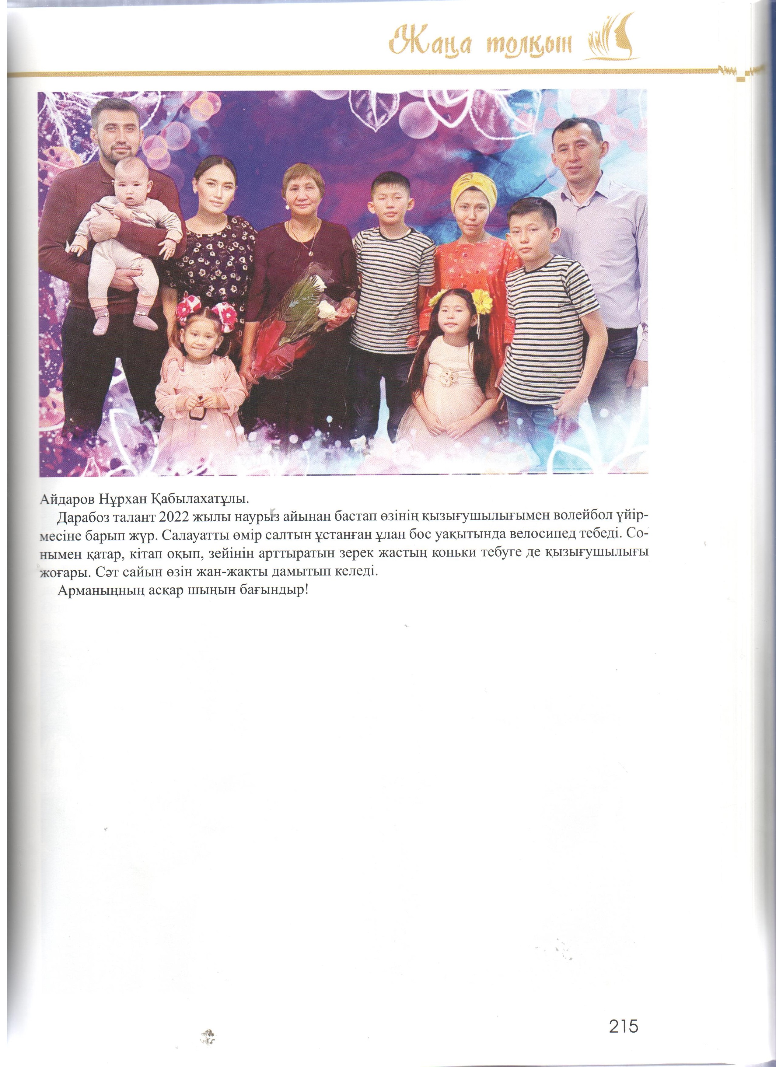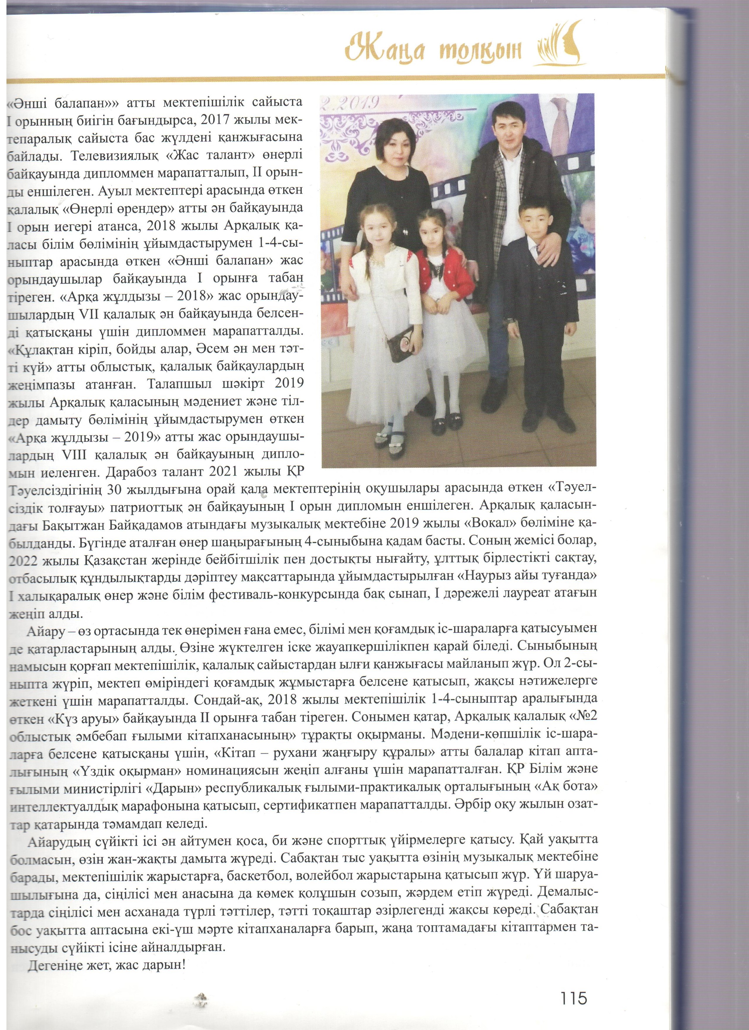 Кітап-энциклопедиядада жас таланттардың отбасы, білім алып жүрген мектебі, жеткен жетістіктері мен қосымша айналысатын сүйікті істері жөнінде ақпарат берілген. Сондай жастайынан өнерді жанына серік еткісі келетін кітаптың бетіне жарыққа шыққан біздің мектебіміздің өнерлі өрендерің атап айтар болсақ: