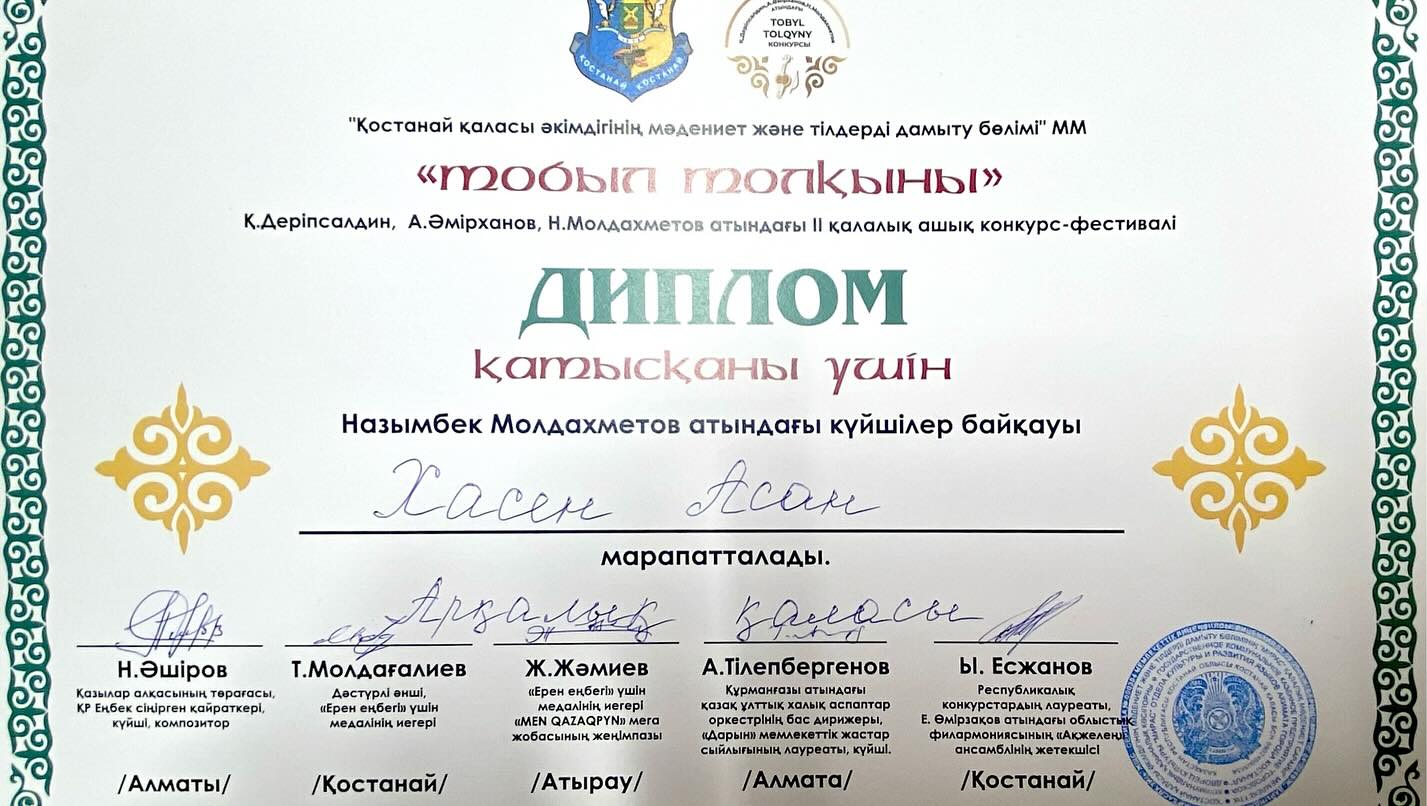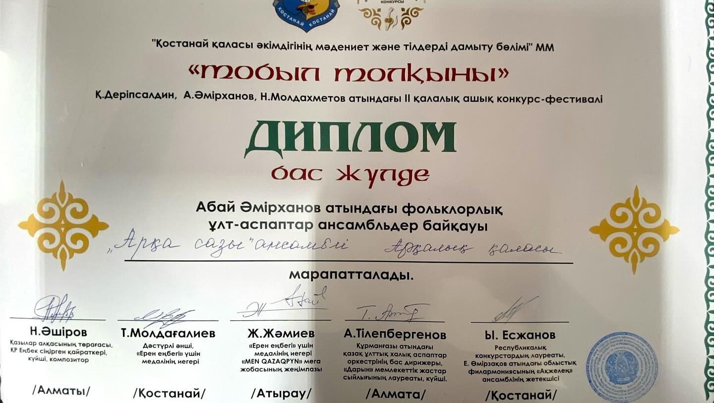 «Тобыл толқыны» ашық қалалық конкурс-фестивалінде «Арқа сазы» халық ұлт аспаптар ансамблі Бас жүлде және 300 000 теңге ақшалай сыйлыққа ие болды! Құттықтаймыз!
