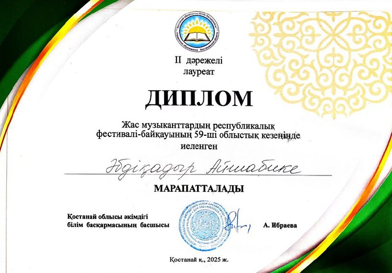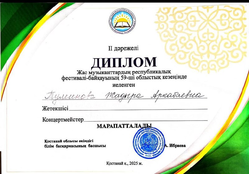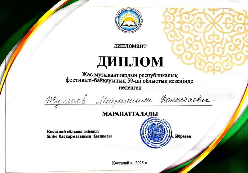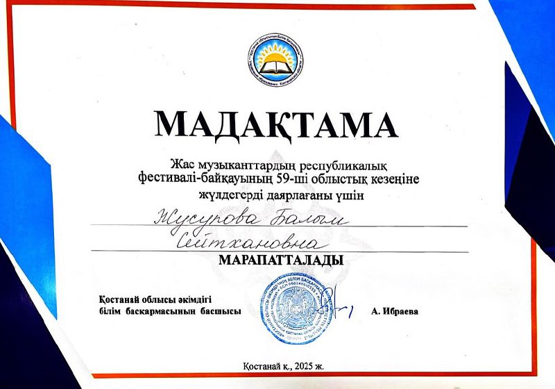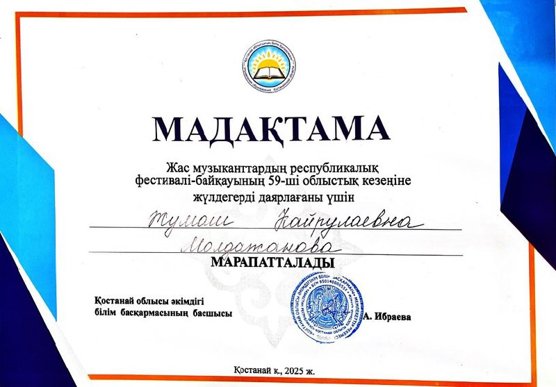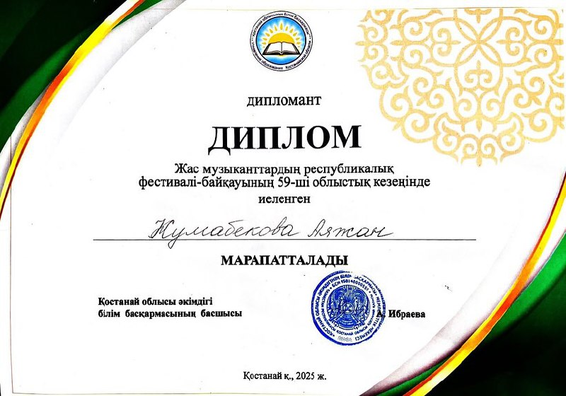 Қостанай қаласында өткен Жас музыканттар республикалық фестивалі - байқауының 59 - облыстық кезеңінде Мектебіміздің дарынды оқушылары жүлделі орындармен марапатталды.