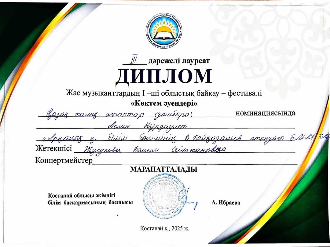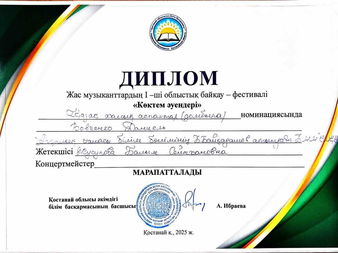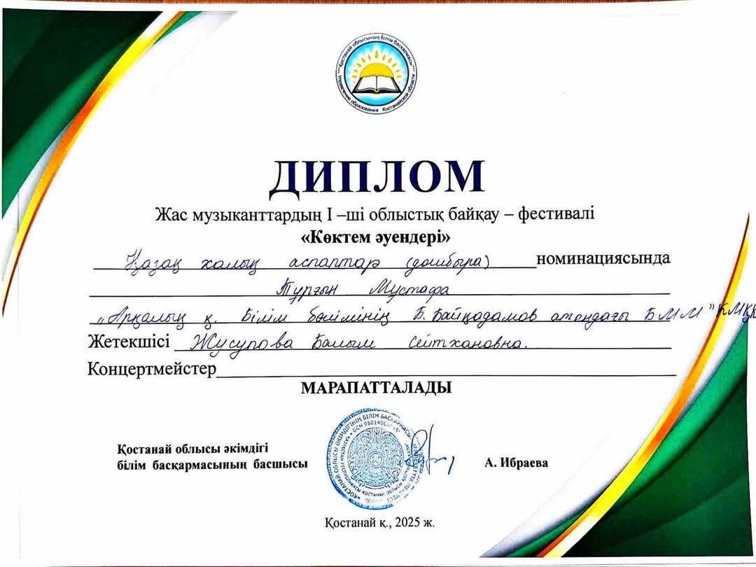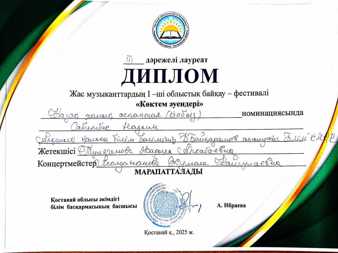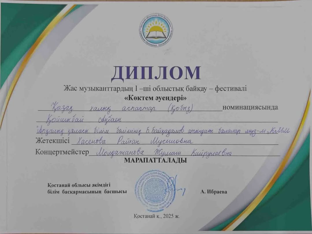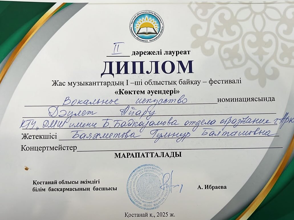 2025 жылдың 9 - 10 сәуір аралығында Қостанай облысы Рудный қаласында өткен «Көктем әуендері» атты жас музыканттардың I - ші облыстық байқау - фестивалінде мектебіміздің дарынды оқушылары өз өнерлерін көрсетіп, жүлделі орындармен оралды.