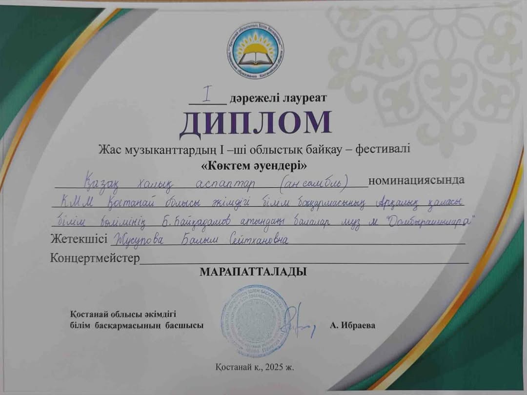 Қазақ халық аспаптар (ансамбль) номинациясында Б. Байқадамов атындағы балалар музыка мектебінің «Домбырашылар» ансамблі 1 дәрежелі лауреат дипломымен марапатталды.