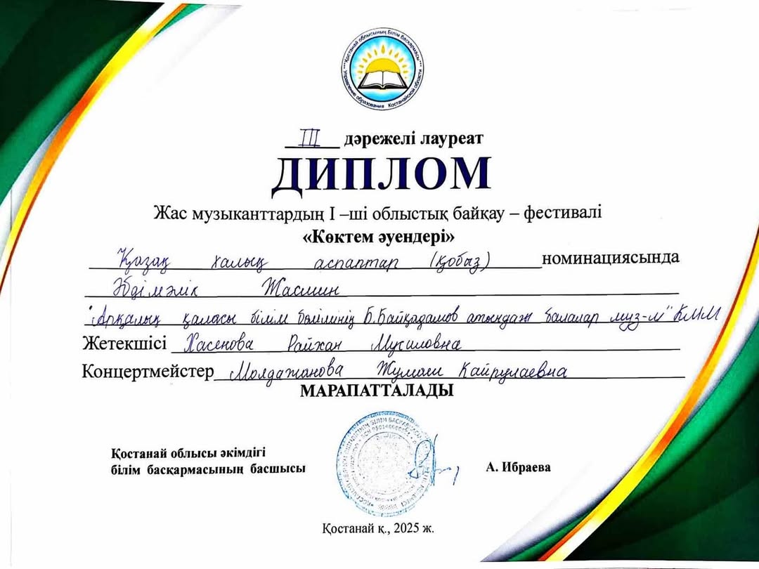 Қазақ халық аспаптар (қобыз) номинациясында 3 дәрежелі лауреат дипломымен Әбдімәлік Жасмин және Сабитбек Назым марапатталды.