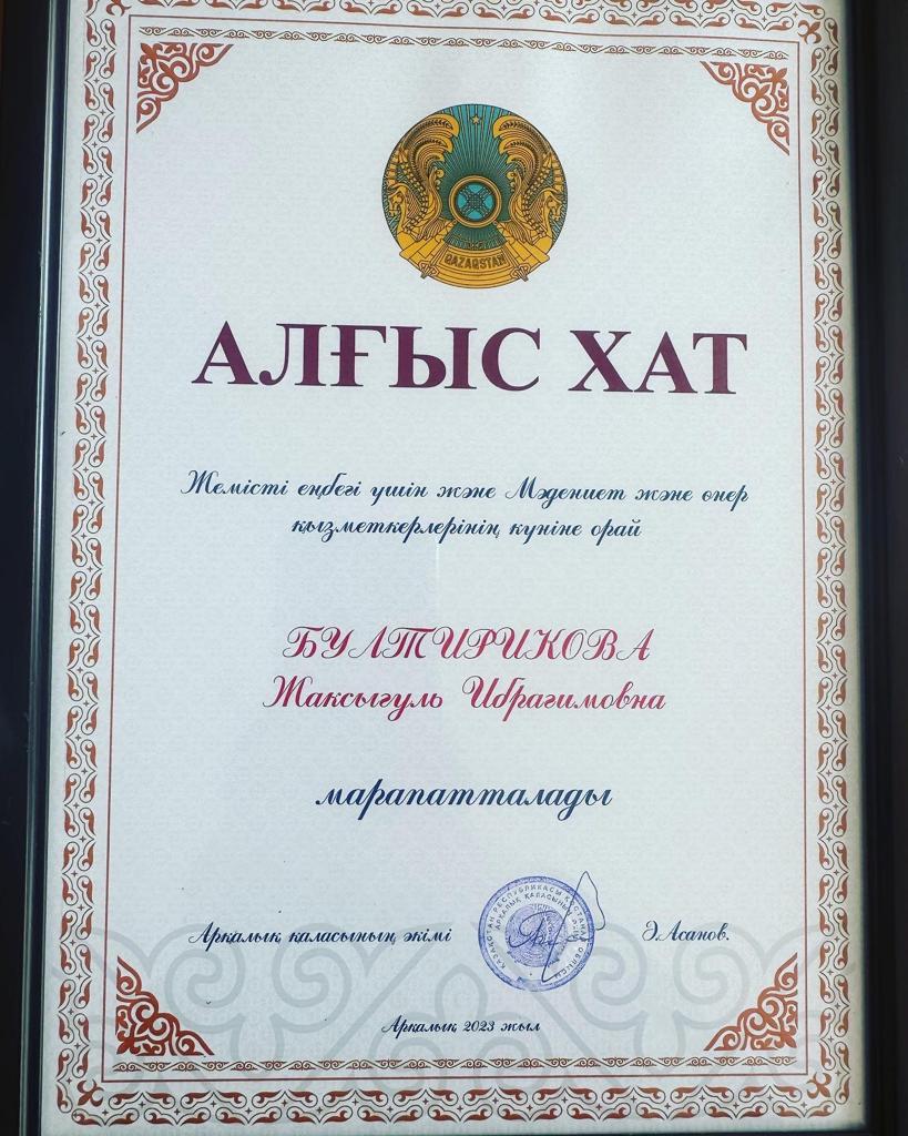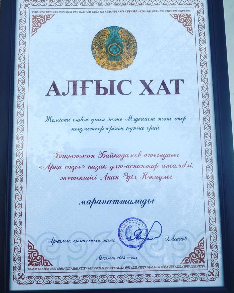 Атап айтатын болсақ,жемісті еңбегі үшін арнайы қала әкімінің Алғыс хатымен мектеп басшысы Жаксыгуль Ибрагимовна және “Арқа сазы”қазақ ұлт аспаптар ансамблі мен жектекшісі Адиль Какиевичке табысталды.Сондай ақ Қостанай өңірінде өнерді дамытып,мәдениетке қосқан үлесі үшін арнайы Қостанай облысы әкімдігі мәдениет басқармасының алғыс хатын Гульнур Балташовна иеленсе,ал шәкірті Таубалды Нұржайна қала әкімінің арнайы алғыс хатымен марапатталды! Мәдениеттің ең тамаша саласында аянбай еңбек етіп жүрген ұлттық өнер мен тарихтың шын жанашырлары бола білген ұстаздарымыз бен шәкіртімізді осынау мерекелерімен,арнайы марапаттарымен шын жүректен құттықтай келе,қажымас қайрат, отбасылық бақыт, сарқылмас дәулет тілей отырып,еңбектеріңіз жана берсін деген тілек білдіреміз!!!