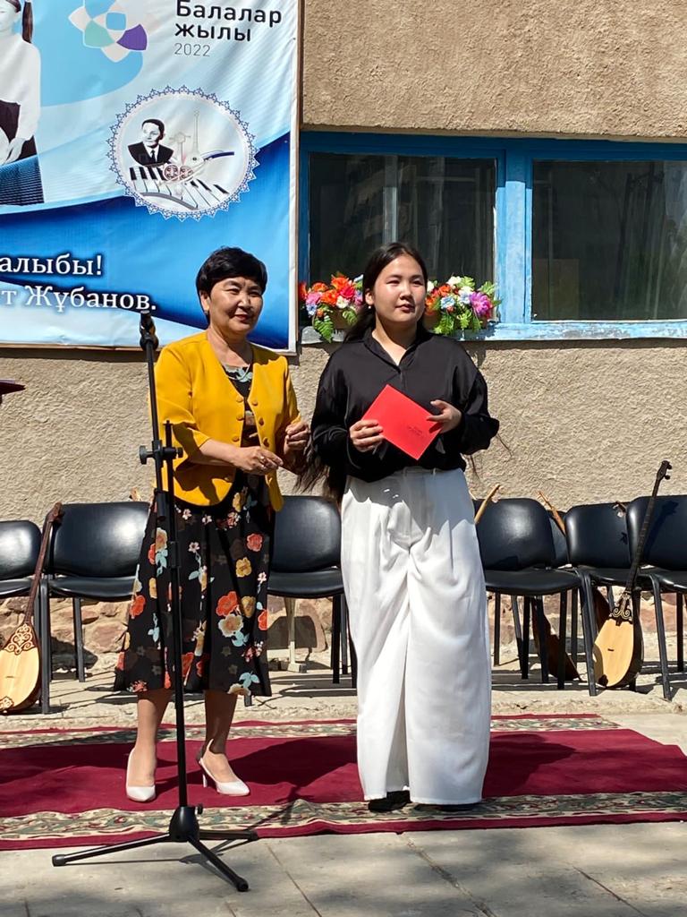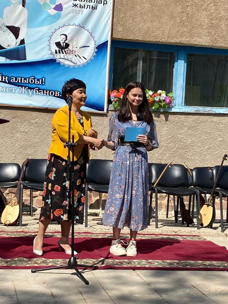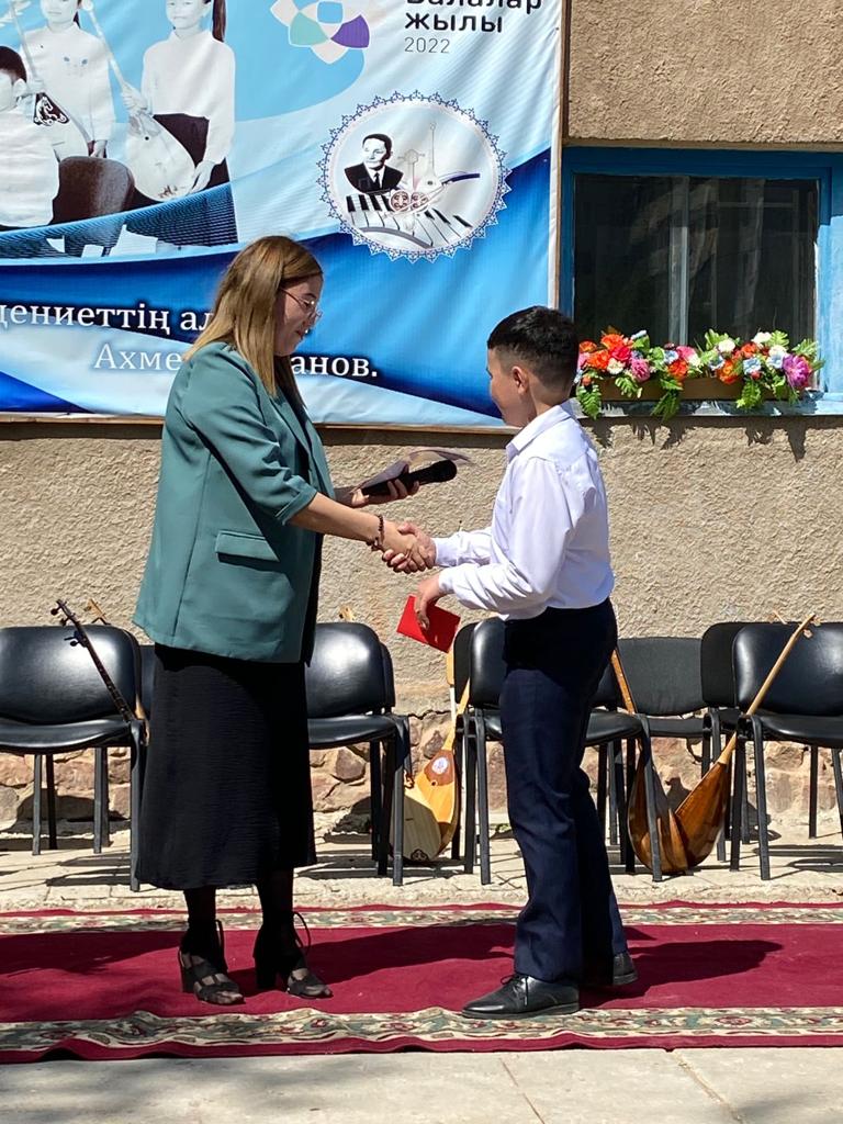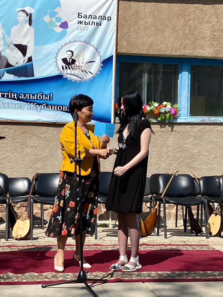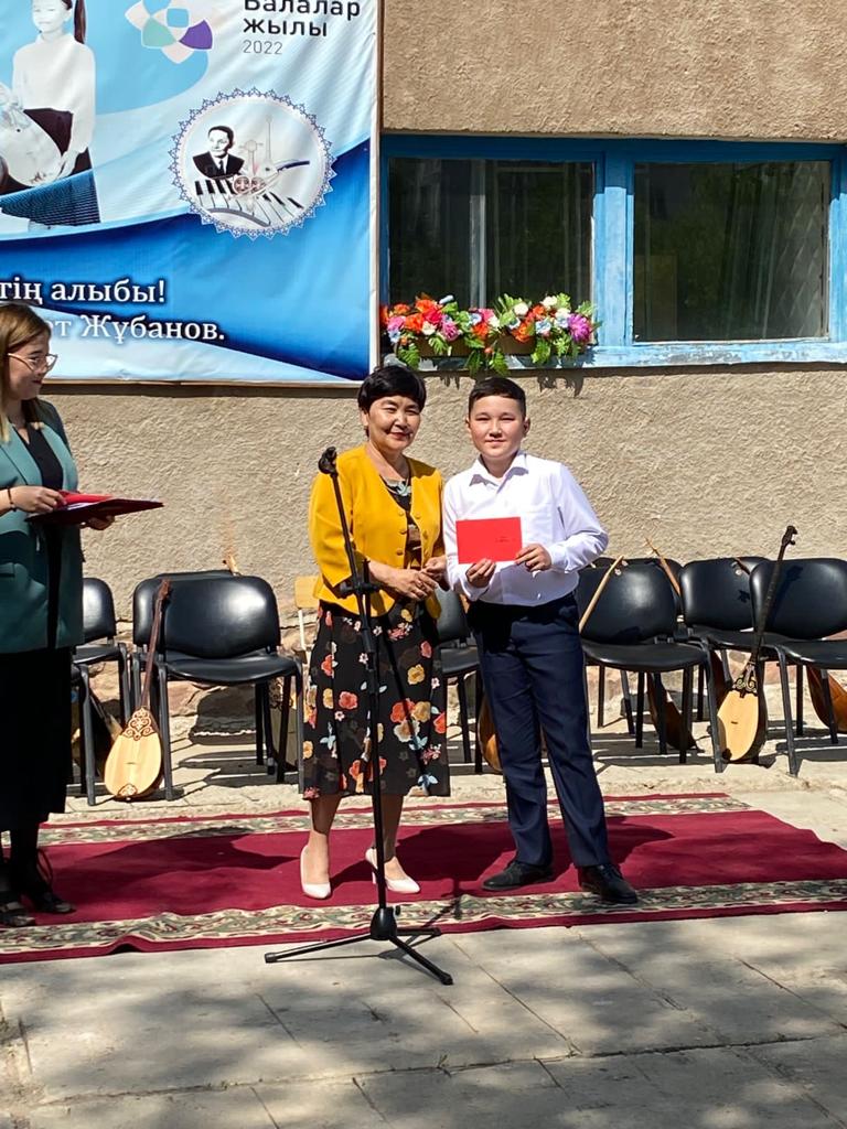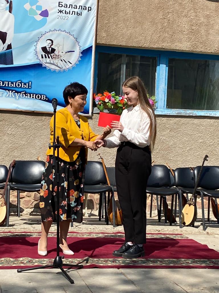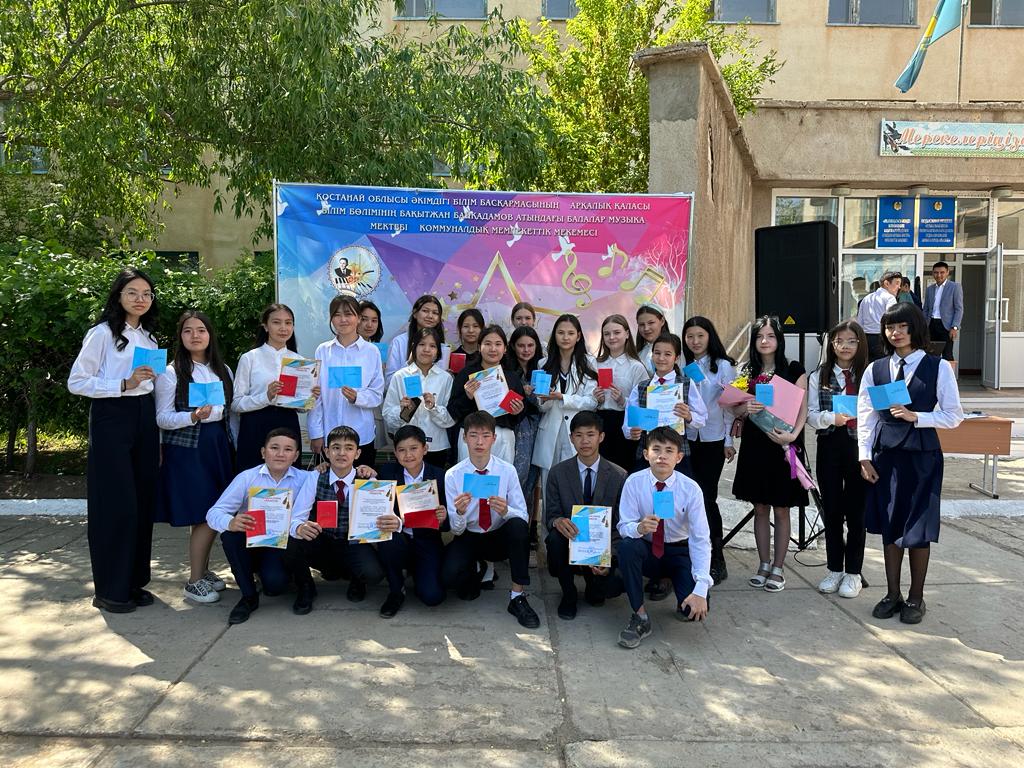 Б.Байқадамов атындағы балалар музыка мектебінде бітіруші түлектерге арналған концерт өтті.Өз кезегінде оқушылар мен ұстаздар өнерлерін ортаға салып, ән мен күйден шашу шашты.Атап айтатын болсақ, бітіруші түлектері мен жетекшілерінен құралған домбырашылар ансамблінің орындауында Құрманғазының «Балбырауын» күйі, Дәулет Айарудың орындауында Ұшқын Жамалбектің әні «Кейкі Мерген» әні кешіміздің шымылдығын ашты.Ары қарай сөз кезегі мектебіміздің директоры Жаксыгуль Ибрагимовнаға беріліп, бітіруші түлектерге салтанатты түрде ортаға шақырылып, Б.Байқадамов атындағы балалар музыка мектебін аяқтағанын растайтын үздік қызыл және жақсы оқығаны үшін көк түсті куәліктер табыс етілді.Келесі кезекте фортепиано бөлімінің бітіруші түлегі Майорова Варвара орындауында Абайдың «Көзімнің қарасы» әні, Мұқан Төлебаевтың «Кестелі орамалын» қобыз бөлімінің бітіруші түлегі Каирден Аяна концертмейстер Молдажанова Жумаш Кайрулаевнаның сүйемелдеуімен орындалды.Сонымен қатар,мектебіміздің мерекелік ic-шараларына белсене араласып жүрген бітіруші түлектерімізге арнайы мектеп директорының мадақтамасын табыстау директордың оқу ісі жөніндегі орынбасары Назира Әділханқызы мен кәсіподақ төрайымы Анна Владимировнаға сөз кезегі берілді.Серік Жұмабековтің “Жас қанат ұраным” әнін трионың орындауында шырқалды. Бүгінгі күнде біздің мектебімізден 2022 - 2023 оқу жылында фортепиано бөлімінен -5 оқушы, халық аспаптар бөлімі-қобыз аспабы бойынша-1 оқушы, домбыра аспабы бойынша-22 жұлдызды шәкірттеріміз музыка әлемінің алғашқы баспалдағынан білім алып, ұшқалы тұр. Алда басталар өмірдің саналы жолы ешкімді адастырмасын,сіздер жердегі жұлдыз болсаңыздар, аспандағы жұлдыздарыңыз өздеріңізге серік болып, алысқа жетелесін деген тілекпен, әсем әнмен қорытындыланған қоштасу концерті түлектерге арнап безендірілген мектеп ауласында естелікке фотосуретке түсумен аяқталды.