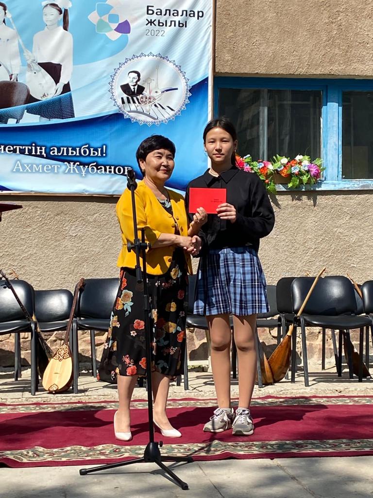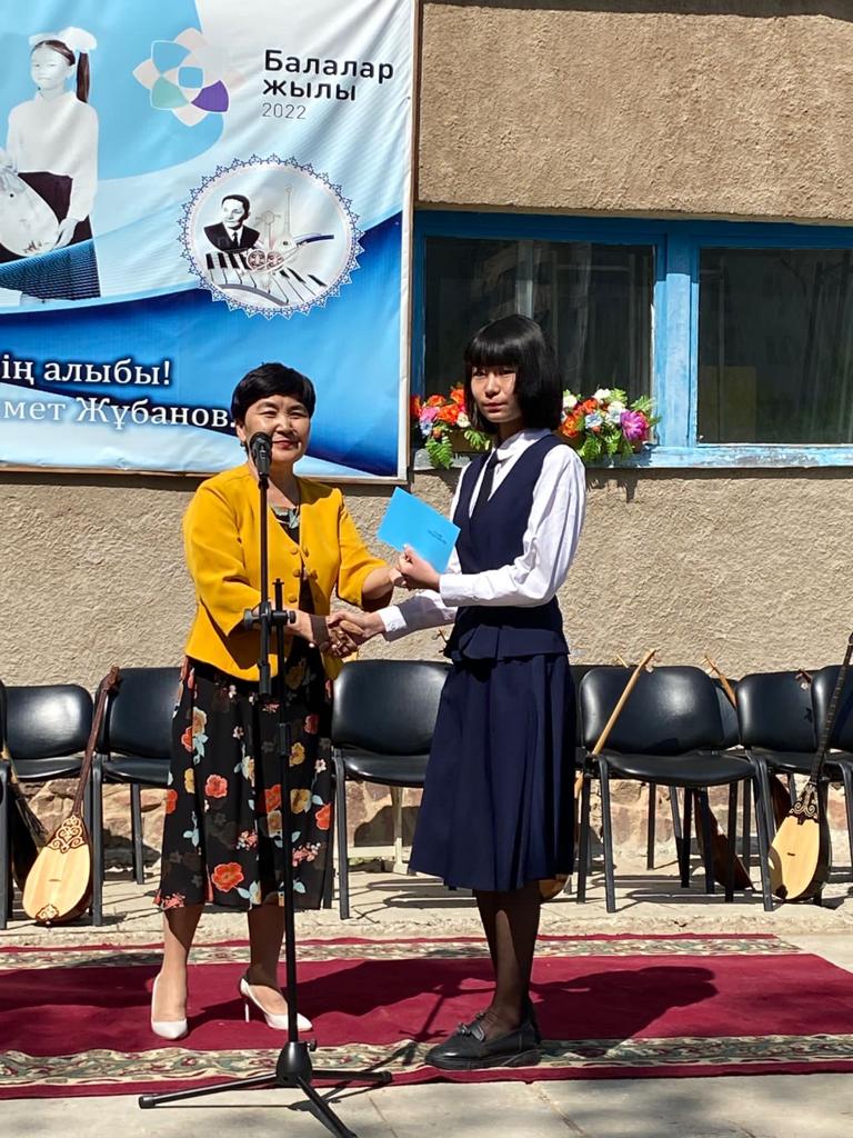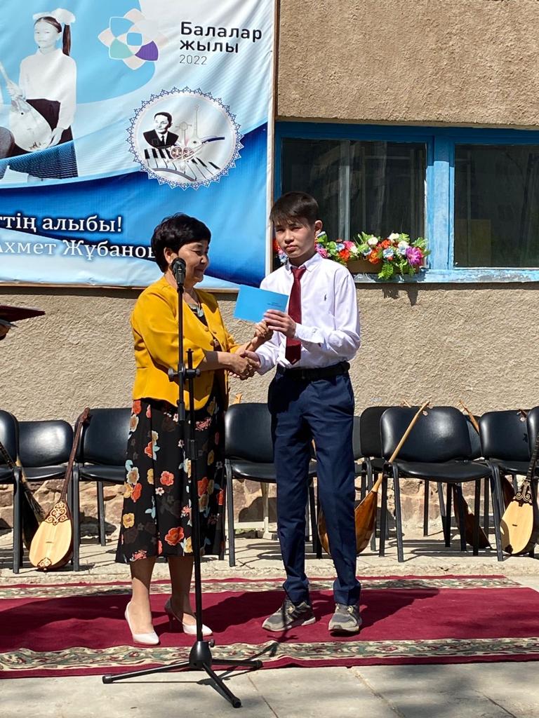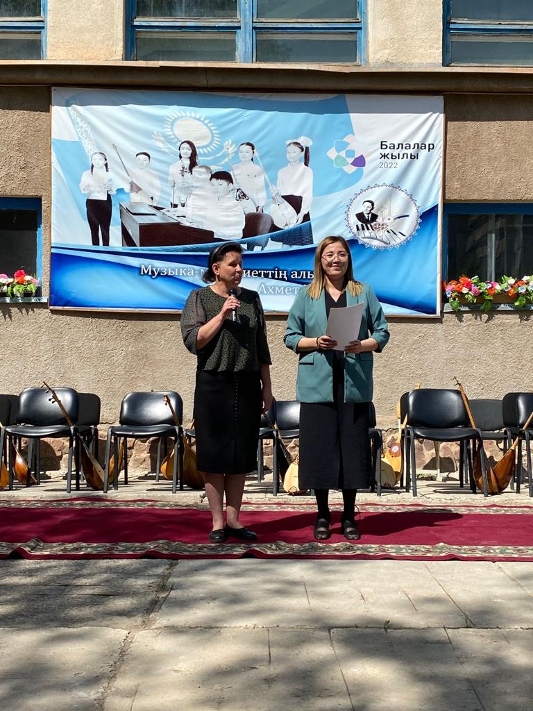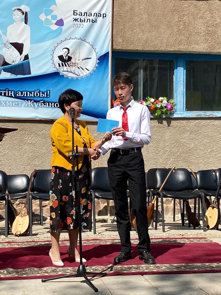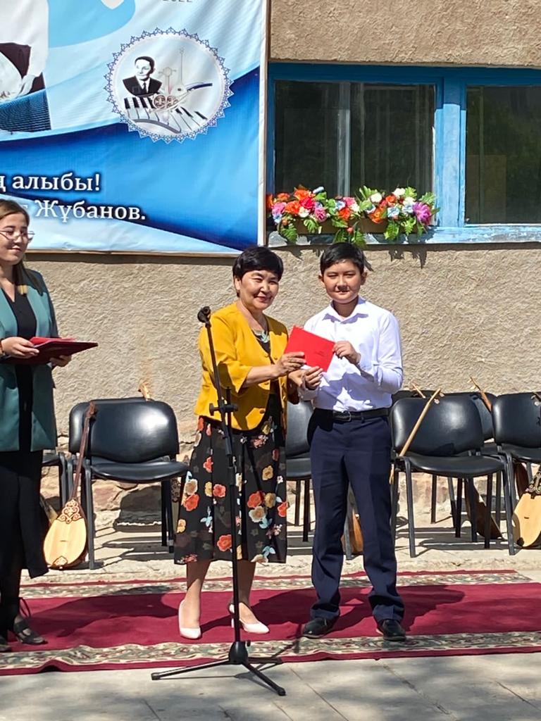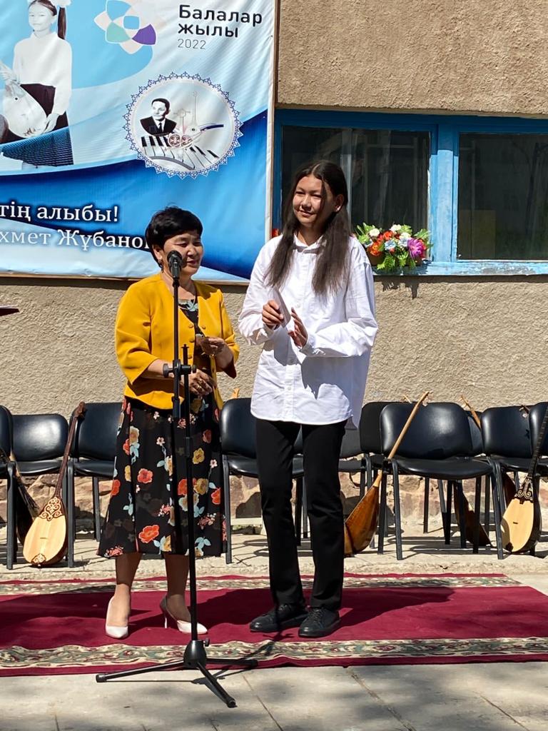 Б.Байқадамов атындағы балалар музыка мектебінде бітіруші түлектерге арналған концерт өтті.Өз кезегінде оқушылар мен ұстаздар өнерлерін ортаға салып, ән мен күйден шашу шашты.Атап айтатын болсақ, бітіруші түлектері мен жетекшілерінен құралған домбырашылар ансамблінің орындауында Құрманғазының «Балбырауын» күйі, Дәулет Айарудың орындауында Ұшқын Жамалбектің әні «Кейкі Мерген» әні кешіміздің шымылдығын ашты.Ары қарай сөз кезегі мектебіміздің директоры Жаксыгуль Ибрагимовнаға беріліп, бітіруші түлектерге салтанатты түрде ортаға шақырылып, Б.Байқадамов атындағы балалар музыка мектебін аяқтағанын растайтын үздік қызыл және жақсы оқығаны үшін көк түсті куәліктер табыс етілді.Келесі кезекте фортепиано бөлімінің бітіруші түлегі Майорова Варвара орындауында Абайдың «Көзімнің қарасы» әні, Мұқан Төлебаевтың «Кестелі орамалын» қобыз бөлімінің бітіруші түлегі Каирден Аяна концертмейстер Молдажанова Жумаш Кайрулаевнаның сүйемелдеуімен орындалды.Сонымен қатар,мектебіміздің мерекелік ic-шараларына белсене араласып жүрген бітіруші түлектерімізге арнайы мектеп директорының мадақтамасын табыстау директордың оқу ісі жөніндегі орынбасары Назира Әділханқызы мен кәсіподақ төрайымы Анна Владимировнаға сөз кезегі берілді.Серік Жұмабековтің “Жас қанат ұраным” әнін трионың орындауында шырқалды. Бүгінгі күнде біздің мектебімізден 2022 - 2023 оқу жылында фортепиано бөлімінен -5 оқушы, халық аспаптар бөлімі-қобыз аспабы бойынша-1 оқушы, домбыра аспабы бойынша-22 жұлдызды шәкірттеріміз музыка әлемінің алғашқы баспалдағынан білім алып, ұшқалы тұр. Алда басталар өмірдің саналы жолы ешкімді адастырмасын,сіздер жердегі жұлдыз болсаңыздар, аспандағы жұлдыздарыңыз өздеріңізге серік болып, алысқа жетелесін деген тілекпен, әсем әнмен қорытындыланған қоштасу концерті түлектерге арнап безендірілген мектеп ауласында естелікке фотосуретке түсумен аяқталды.